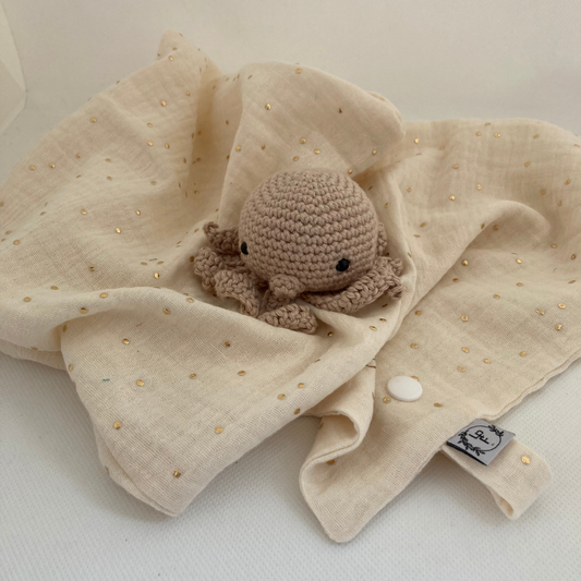Doudou Pieuvre - Gaze de coton Écrue à pois dorés