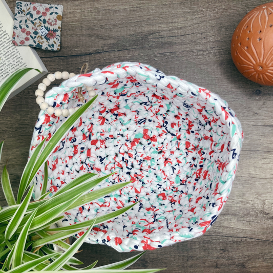 Panière en crochet – Blanc chiné (Rouge, vert)
