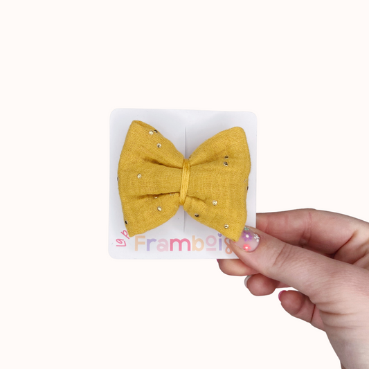 Barrette Nœud - Jaune moutarde à pois dorés