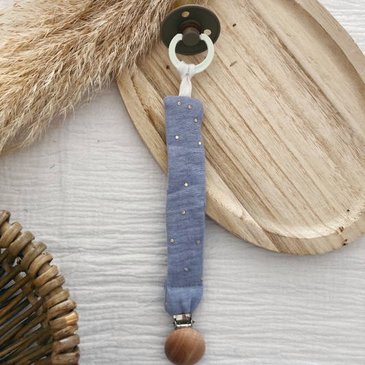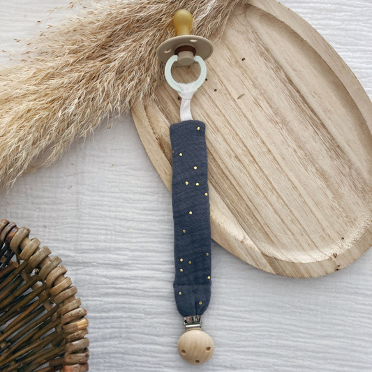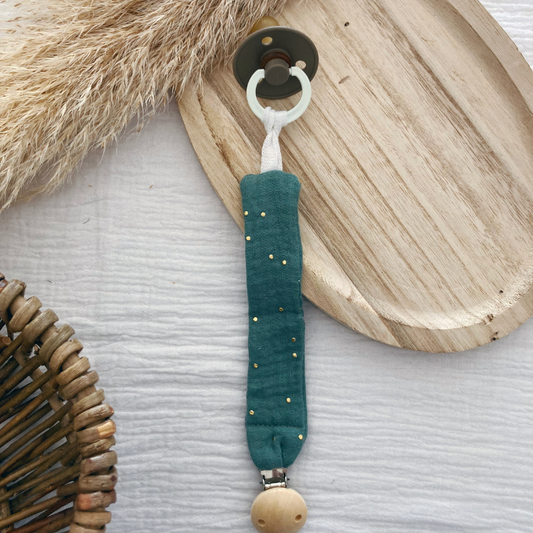 Attache tétine - Gaze de coton Vert-de-gris à pois doré