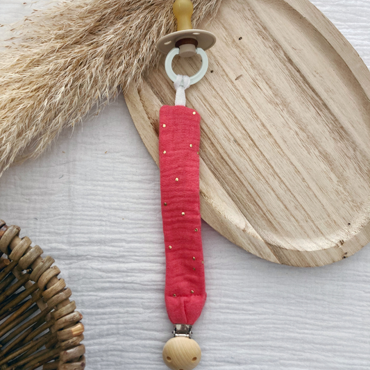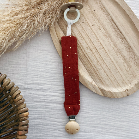 Attache tétine - Gaze de coton Moutarde à pois dorés