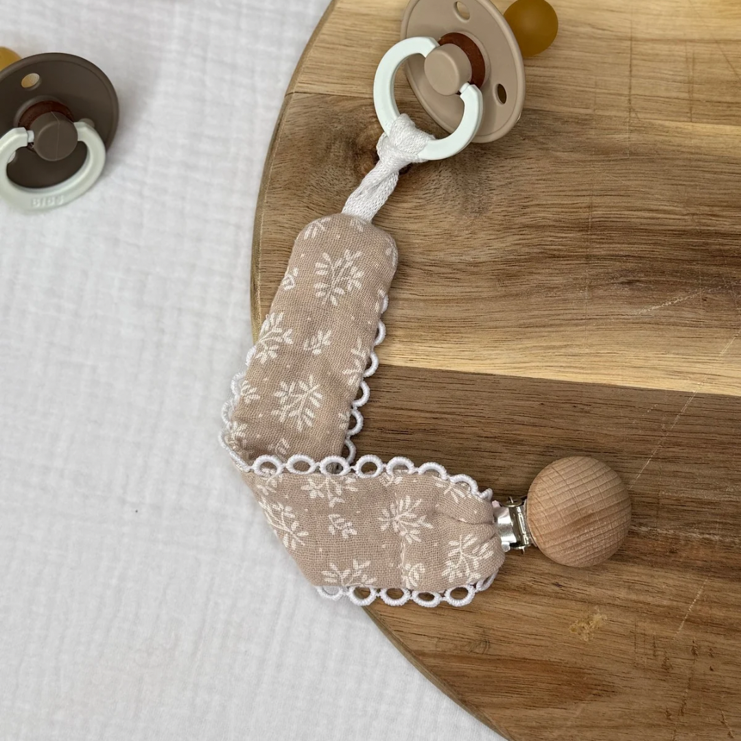 Attache tétine - Beige fougère + dentelle