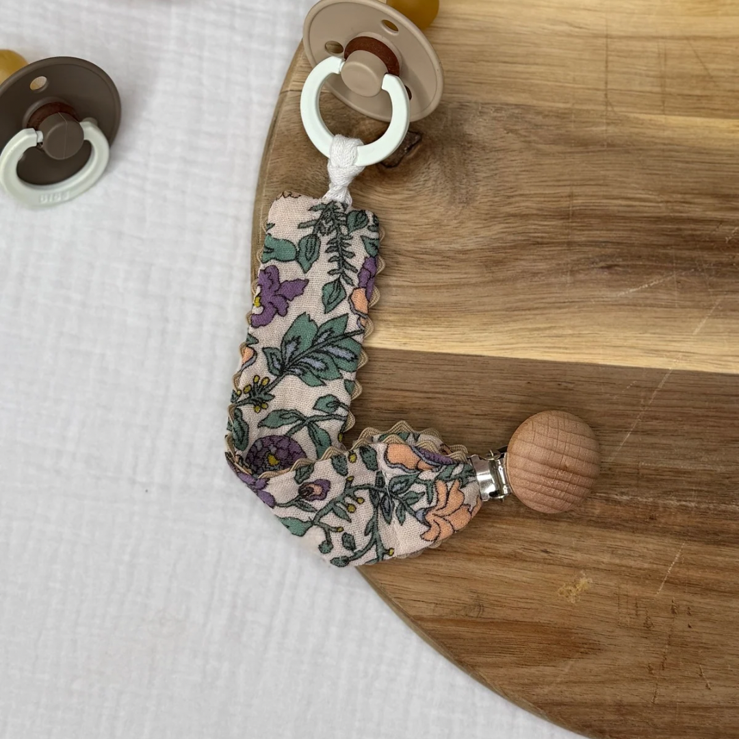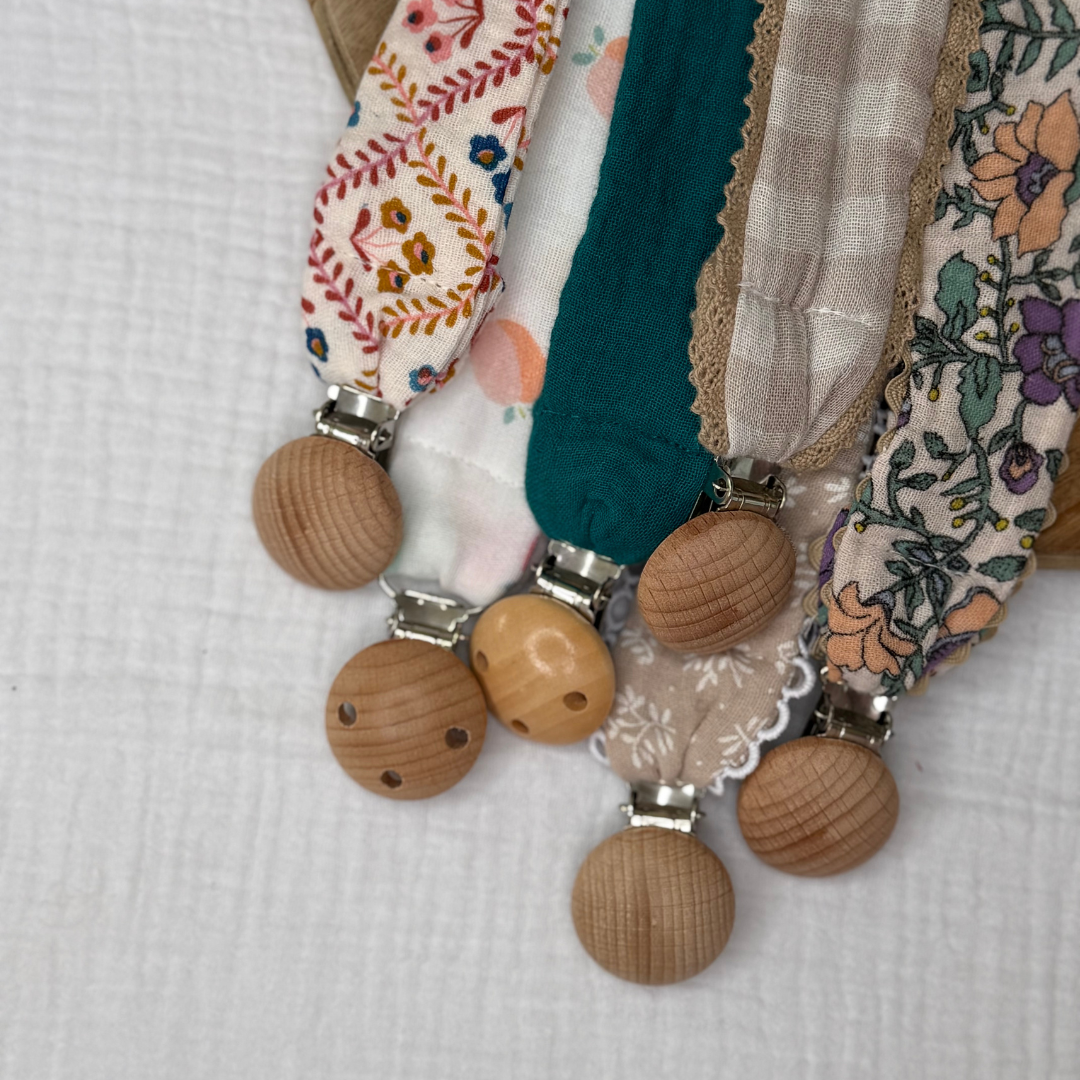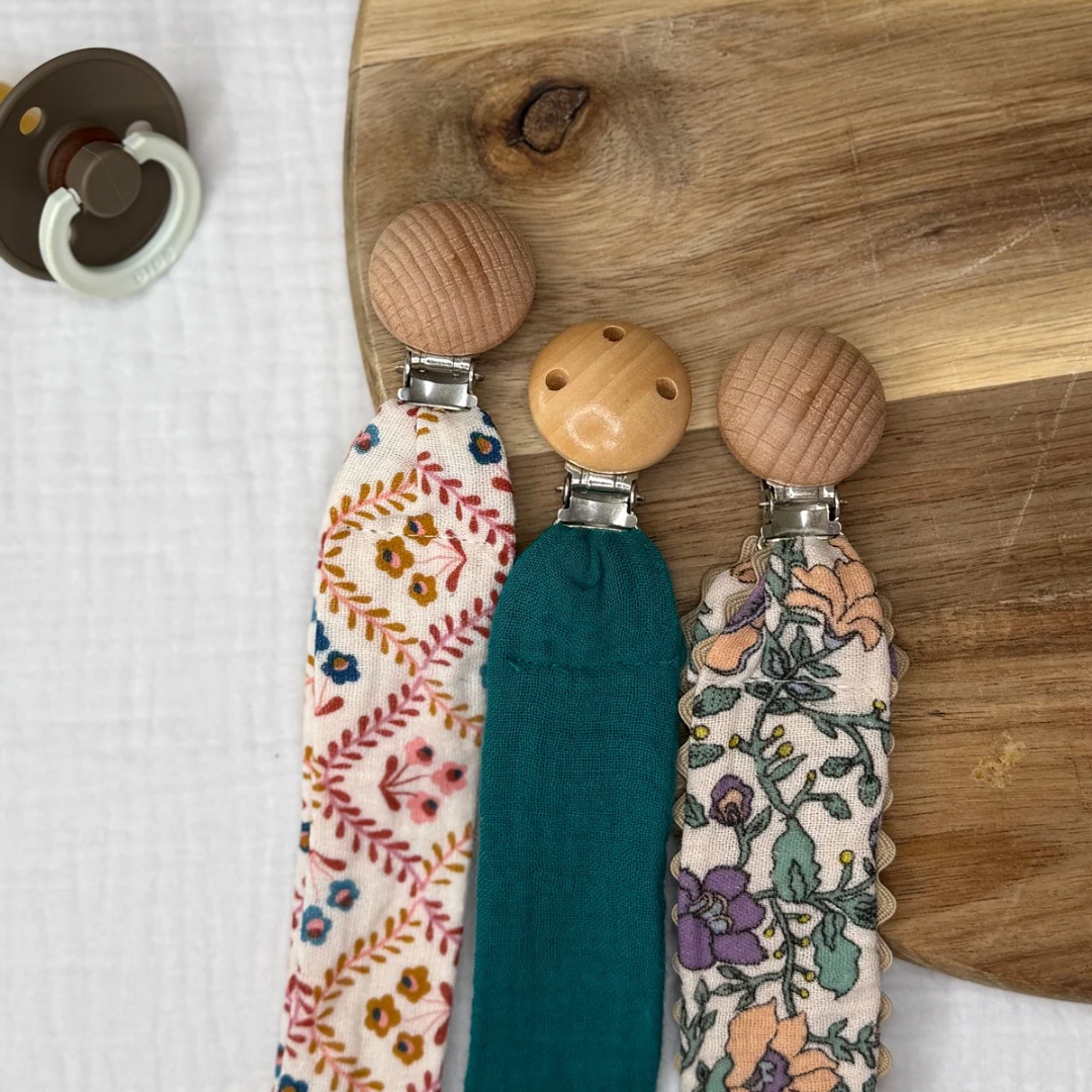 Ne perdez plus jamais la précieuse tétine de votre bébé grâce à notre attache tétine alliant style, sécurité et praticité. Fabriquée en gaze de coton Oeko-Tex, une matière douce et respectueuse de la peau délicate des tout-petits, cette attache tétine est conçue pour être aussi belle que fonctionnelle. L'attache en bois naturel assure une fixation solide, tout en ajoutant une touche d'élégance.