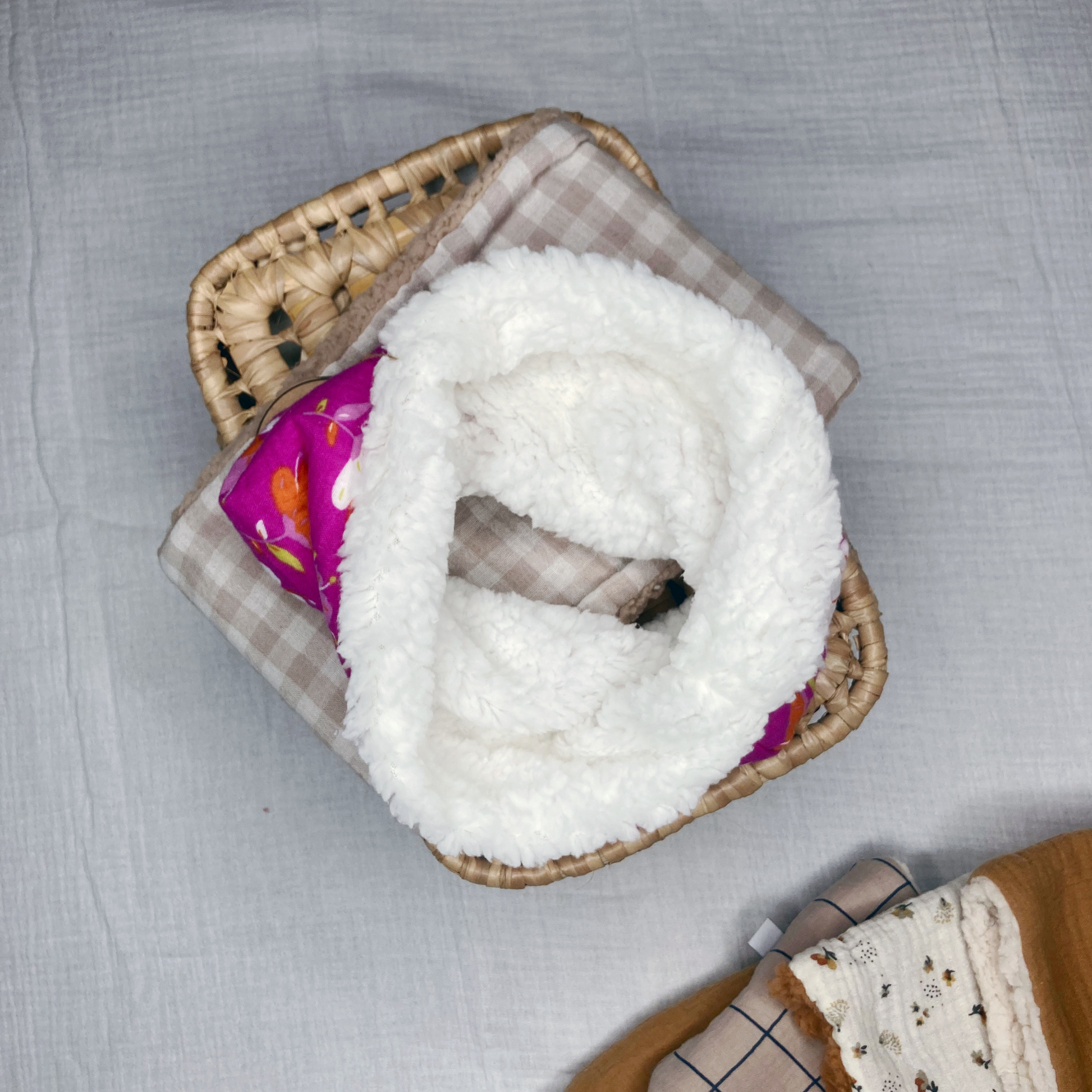 -Réversible : Deux styles en un ! Une face en double gaze de coton pour un look chic et épuré, et une face en sherpa ultra-doux pour un confort maximal.